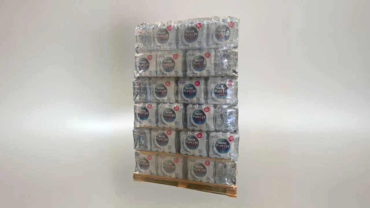 Water packing with PET cups. Coalition shrink film for water bottles.
